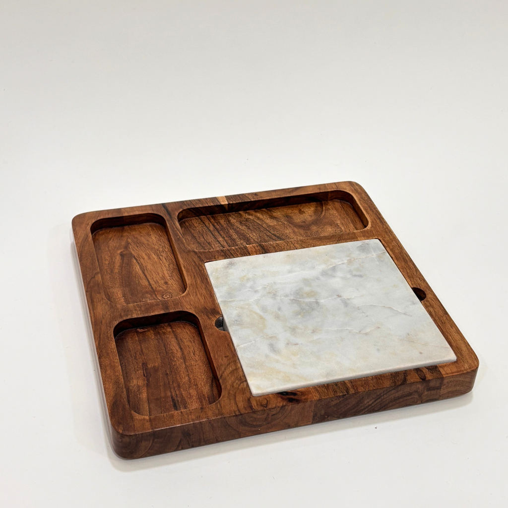 Serve in style with this elegant cheese platter that combines the warmth of natural wood with the sophistication of smooth marble. Thoughtfully designed with carved sections, it provides the perfect space to arrange cheese, crackers, nuts, and accompaniments, while the marble insert keeps your cheese cool and fresh.