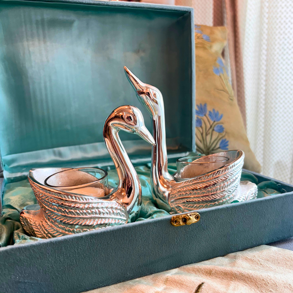 Introduce a touch of sophistication and tranquility to your home with the Silver Swan Diyas - Set of 2. This beautifully crafted decorative piece features a stunning silver-plated finish that enhances its intricate design. It comes with 2 glass wax candles in a gift box too.