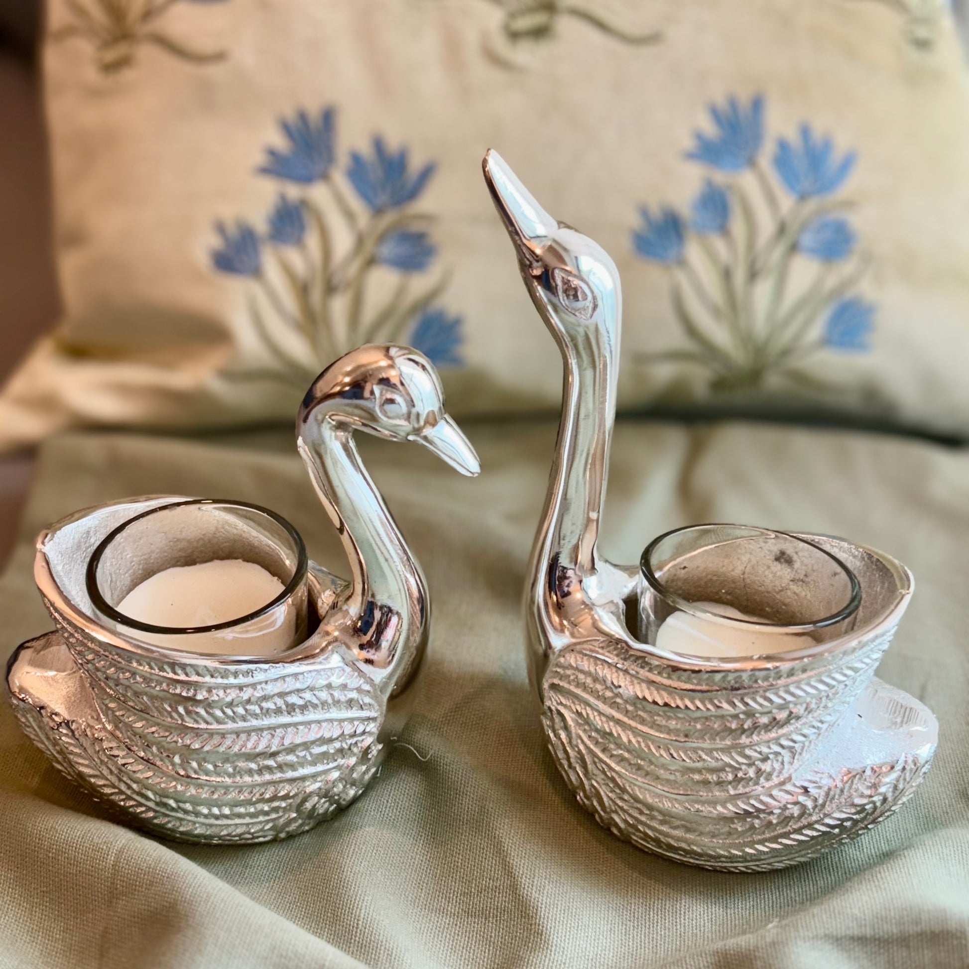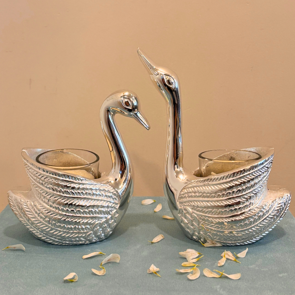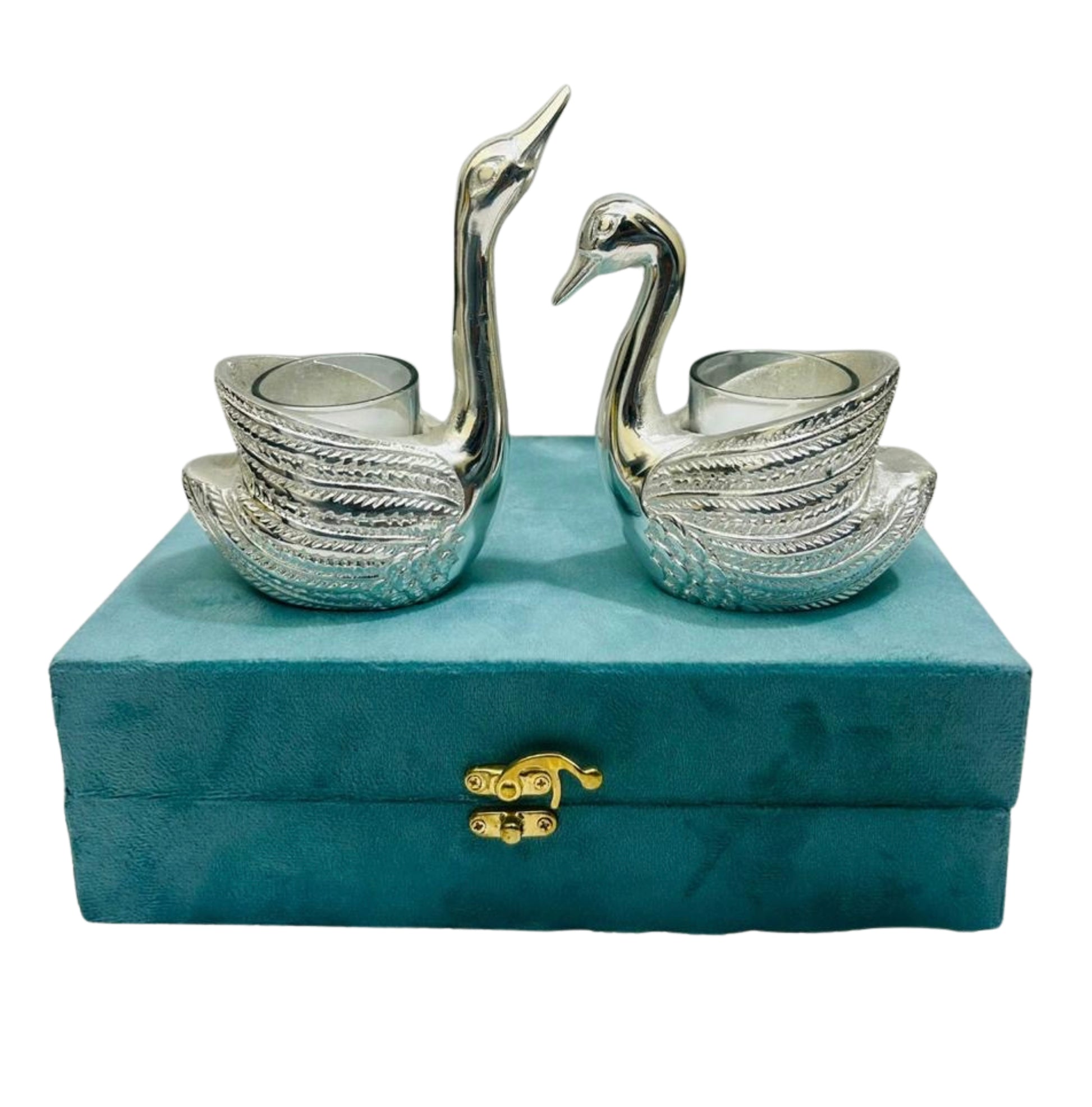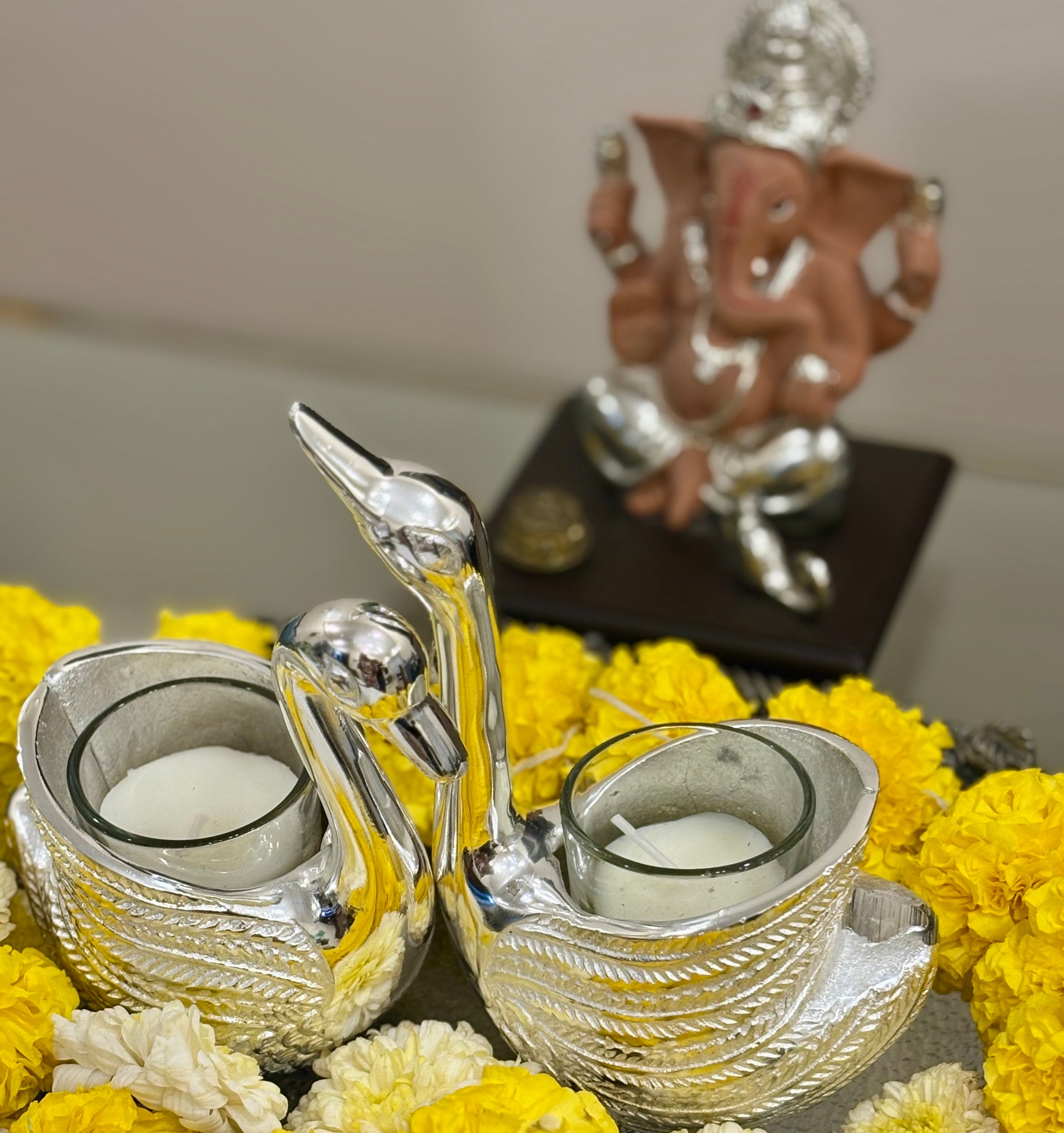 - Elegant Design: Features 2 beautifully detailed Swan Diyas or candle holders with glass wax candles too. The design comes with a refined silver-plated finish, adding a touch of luxury to your decor.